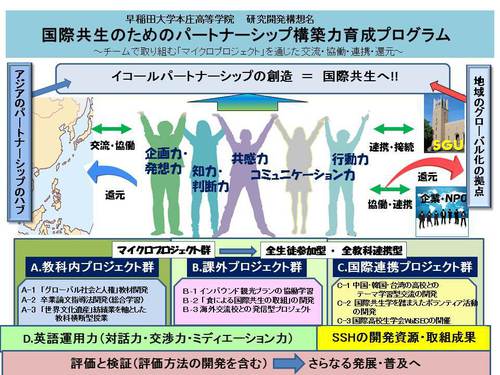 早稲田大学本庄高等学院は平成27年度スーパーグローバルハイスクール(SGH)の指定を受けました。以下は文部科学省の平成27年3月31日(火)付の「報道発表」からの一部抜粋です。なお詳細は文部科学省の関連ページをご参照ください。